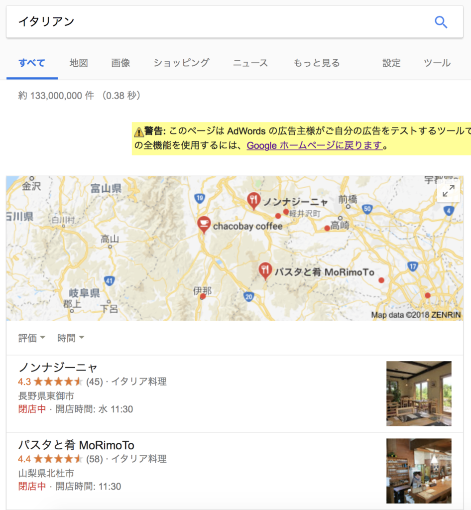 この時の検索で1位になったのは長野県のレストランで、2位は山梨県のレストランでした。もしあなたが東京でビジネスをしていたとして、キーワード「イタリアン」で上位表示を狙うなら、名古屋や山梨など全国のイタリアンと戦うことになりますよね(これをローカルSEOとの対比で、ナショナルSEOと呼ぶことがあります)。