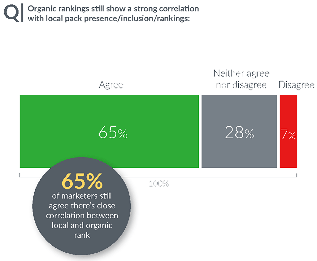 このようなローカルパックの順位とオーガニック検索の順位との間の相関関係は、今までに多くのマーケッターが目にしているようです。その結果、約65%の専門家が両者の間の強い相関関係を信じているという結果が出ています。